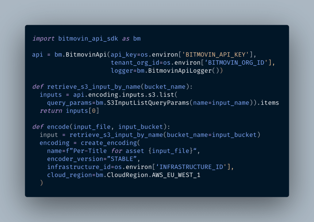 You will previously have configured an S3 Input object on the Bitmovin platform that allows the encoder to grab files from that bucket. For simple workflows with a single watch folder, you would not even need to retrieve the bucket name from the event data, but here we do it to keep the code generic and allow multiple watch folders in different buckets.